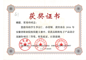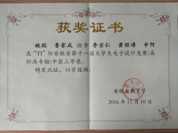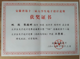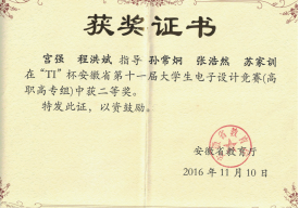 积极参加各类技能大赛,旨在通过大赛引领和促进专业教学改革,提升本专业人才培养水平,培养学生综合能力,专业教师指导学生多次参加安徽省大学生电子设计竞赛、安徽省职业院校技能大赛电子产品设计及制作赛项,获得二等奖2项、三等奖5项。