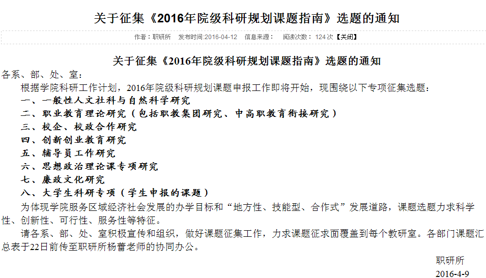 转发职研所《2016年院级科研规划课题指南》选题的通知