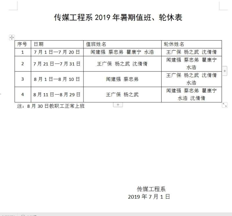 传媒与设计学院2019年暑期值班表