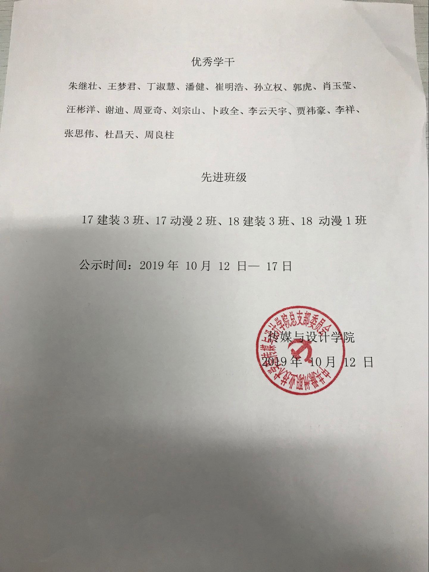 传媒与设计学院优秀学干、先进班级公示