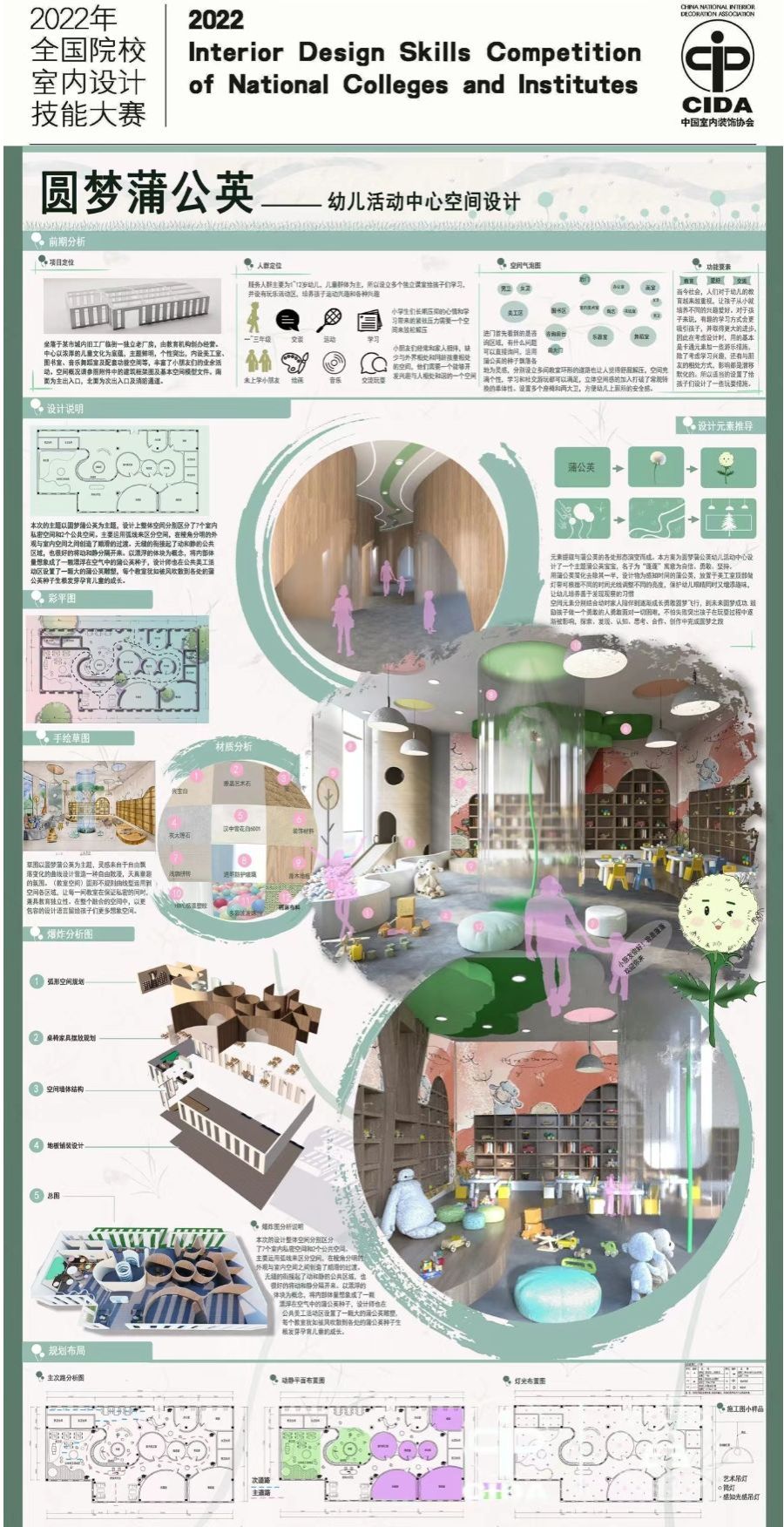2023 年全国院校室内设计技能大赛由中国室内装饰协会主办,安徽省省赛由铜陵职业技术学院传媒与设计学院成功承办,本次大赛共 7所院校,8 支队伍获得安徽省省赛一等奖,由Beat365传媒与设计学院王瑶、于雯雯老师指导,钱野、朱婷婷参赛团队创作的作品《BLBL天使宝贝—幼儿活动中心设计》斩获一等奖前3名。室内艺术设计赛项注重考察参赛选手设计创意表现的能力,需要各个模块之间紧密的配合,从手绘创意到效果图、施工图以及设计说明和展板制作,环环相扣,前后紧密联系。