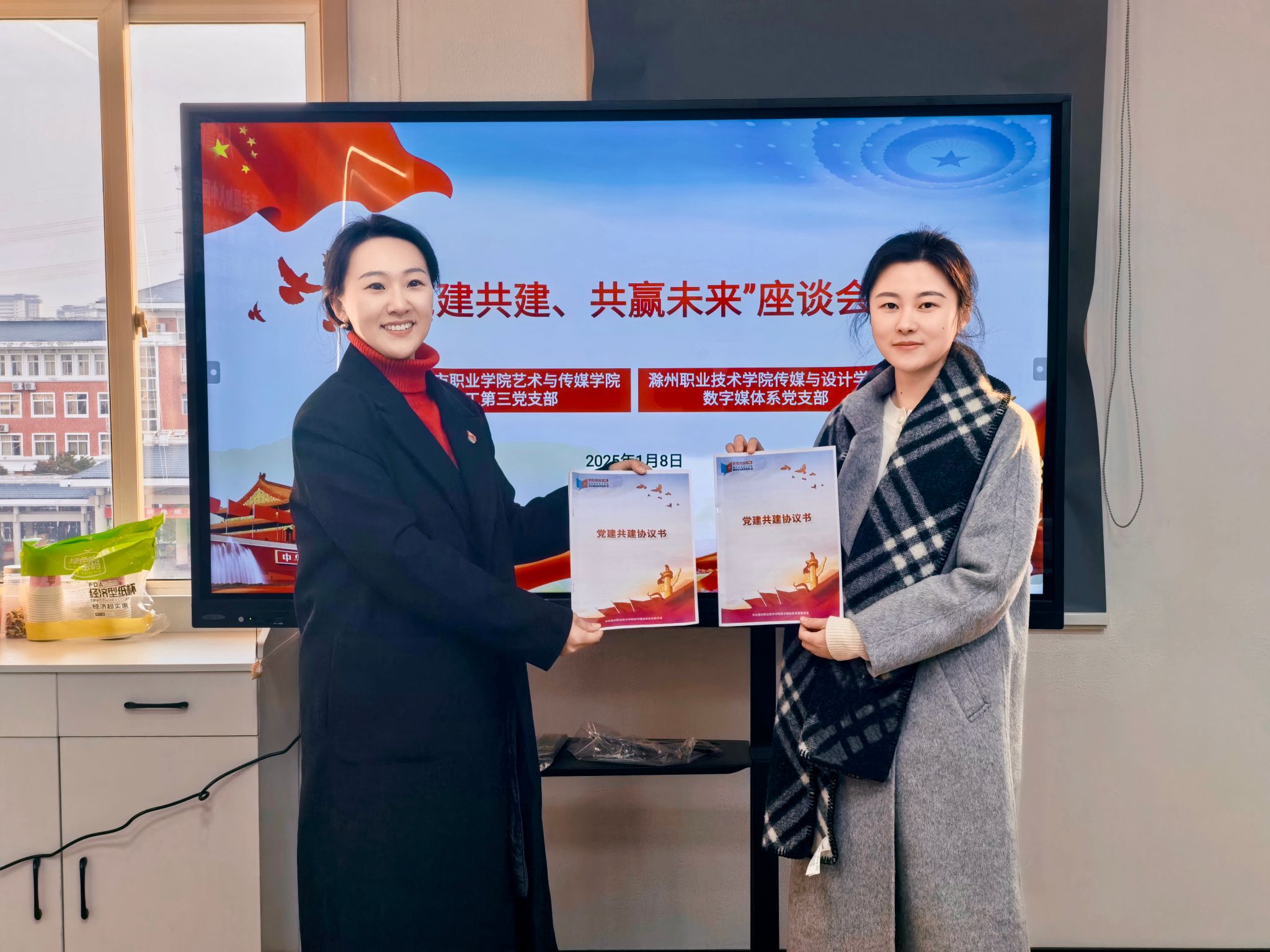 为学习贯彻党的二十届三中全会精神,深入贯彻落实党中央全面从严治党要求,充分发挥基层党建的核心引领作用,构建结对帮带、双向促进、共同提高的基层党建格局,进一步探索创新党建工作,全面开展基层党组织结对共建活动。1月8日下午,Beat365唯一官方网站传媒与设计学院数字媒体系党支部联合滁州城市职业学院艺术与传媒学院教工第三党支部开展“党建共建、共赢未来”座谈会暨主题党日活动。本次活动旨在通过党建共建这一桥梁,促进双方深度交流合作,切实提升党员思想政治素养与文化内涵,增强党组织的凝聚力与战斗力。