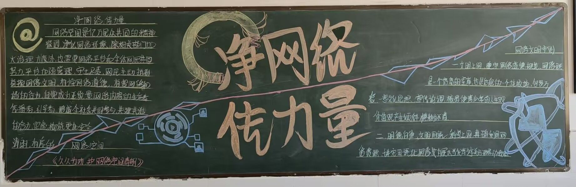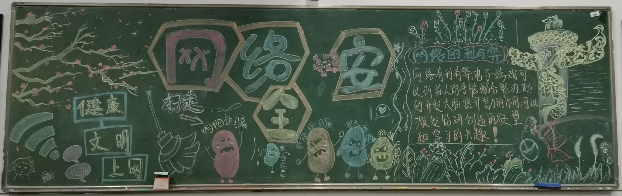 团员们认真搜集了有关网络安全教育的资料,精心设计版面,设计出一幅幅构思独特、内容丰富、形式新颖的主题黑板报。各班团支部黑板报可谓亮点纷呈:有文明上网宣言、健康上网歌曲歌词、文明上网公约等等。