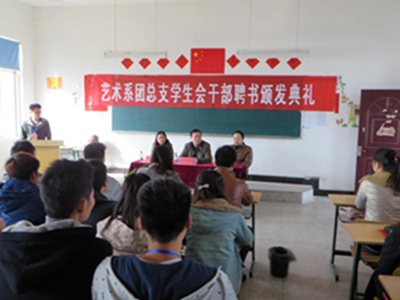 日前,艺术设计系党总支在艺术楼举行仪式,向团总支、学生会干部颁发聘任书。参加大会的有系总支书记王广保团总支书记琼、老师以及学生会和团总支所有成员。
