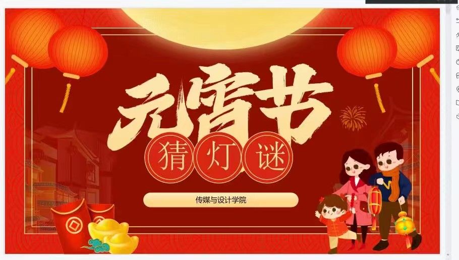 “玉兔迎春辞旧岁,张灯结彩闹元宵。”传媒与设计学院团总支为让广大团员青年更好地感受一年一度的传统元宵佳节,于2023年2月5日开展了“趣味猜灯谜,十五闹元宵”线上主题活动。