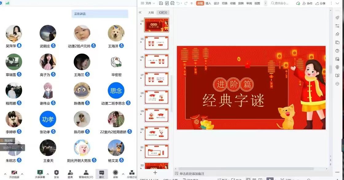 活动伊始,学院学生会主席吴萍萍宣传相关知识,让同学们深入了解了元宵节的传统饮食文化,随后带领同学们进行了线上活动。活动设置元宵节传统猜灯谜环节,15条文字类、自然类、等多方面知识的谜面,大家热情高涨积极开动脑筋破解谜,热情高涨、你争我抢、竞相猜谜,处处洋溢着喜庆祥和的节日氛围。同时线上活动设置看图猜成语环节,通过大家喜闻乐见的动漫图片来猜测相应的成语,同时,成语包含了美好的寓意、有趣的故事。大家积极参与,共同猜词,图文并茂,现场氛围十分活跃。