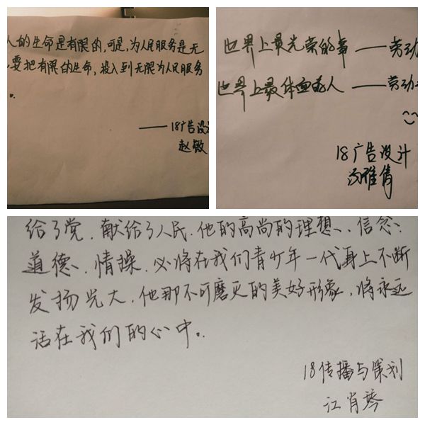 活动线上开展后,活动的主要形式是用文字来表达对雷锋的赞美。陆续受到同学们广泛关注,一共共收到作品46份,作品中同学们用工整的文字以表达对雷锋的敬佩之情,简短的文字也透露出了对雷锋精神内涵的理解。