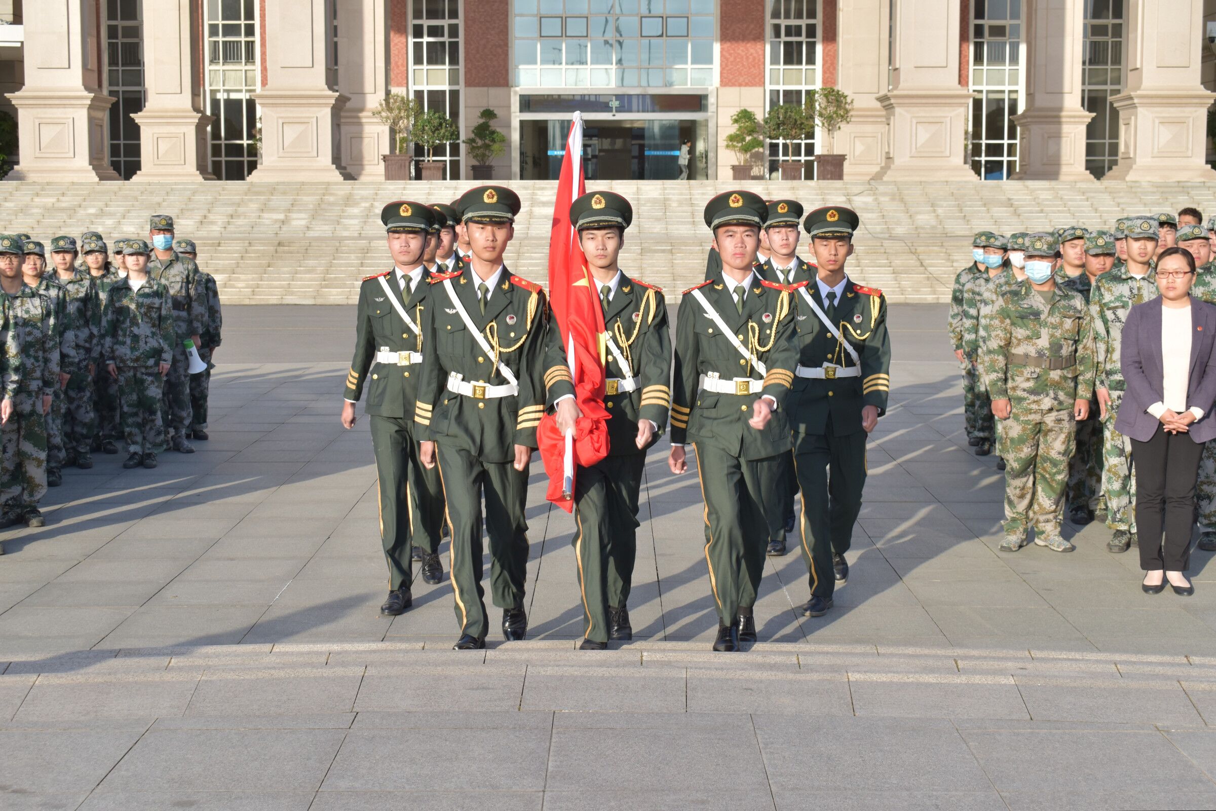 当国歌响起,五星红旗在护旗手的护卫下迎风招展,他们迈着威武的正步缓缓走向升旗台。升旗台下序列整齐的新生代表们,随着国旗缓缓升起,全体人员注目行礼。