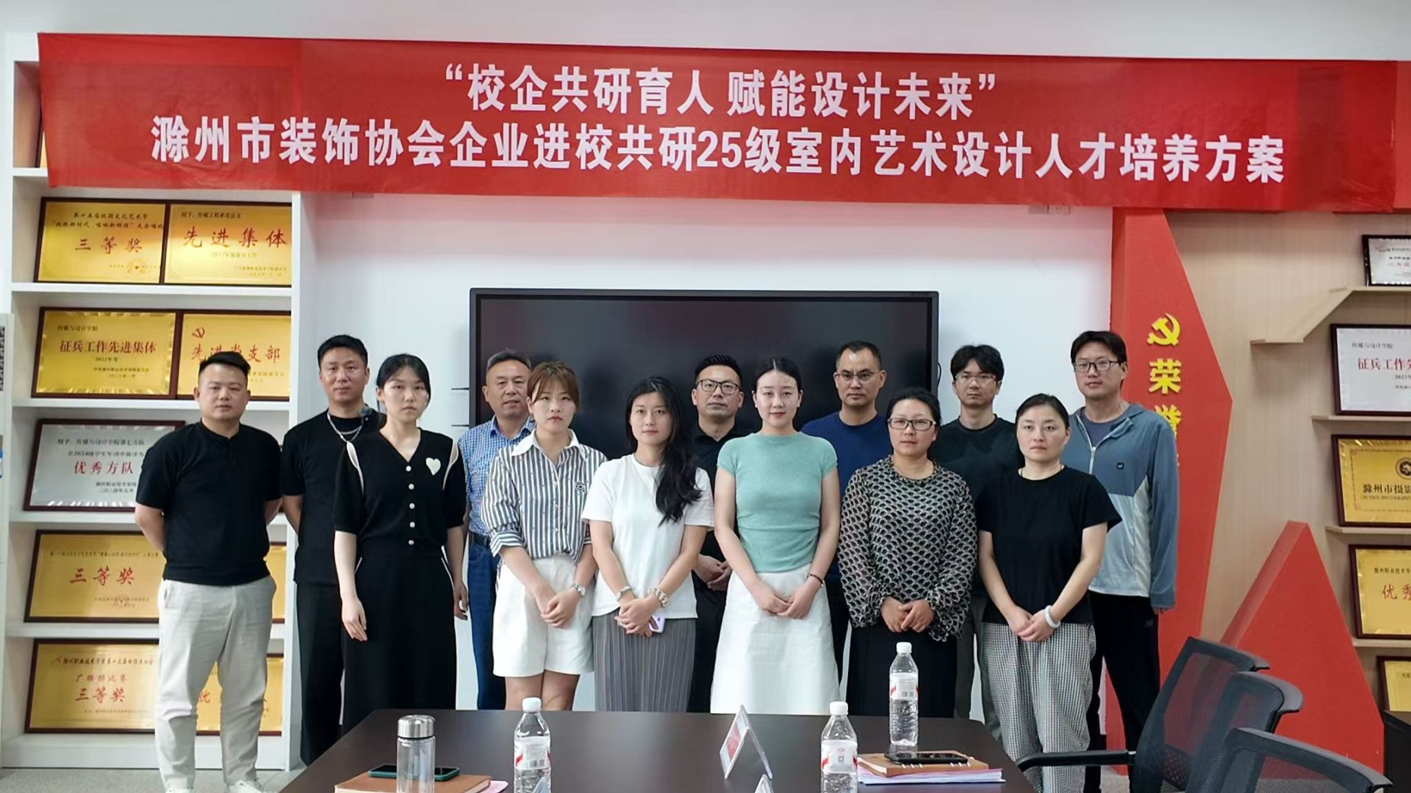 6月26日下午,“校企共研育人 赋能设计未来”——滁州市装饰协会企业进校共研25级室内艺术设计人才培养方案专题会议在德馨楼302会议室成功举办。本次会议邀请了滁州建筑装饰协会设计专业委员会成员的五家标杆企业,包括滁州天造地设装饰有限公司、滁州市久烁装饰设计有限公司、滁州山舍装饰设计有限公司、滁州匠客装饰工程有限公司、安徽酷威环境工程有限公司,传媒与设计学院党总支书记王广保、设计艺术系主任薛梦琪、室内艺术设计专业负责人黄瑞及全体专业教师参加了会议。会议由薛梦琪主持。