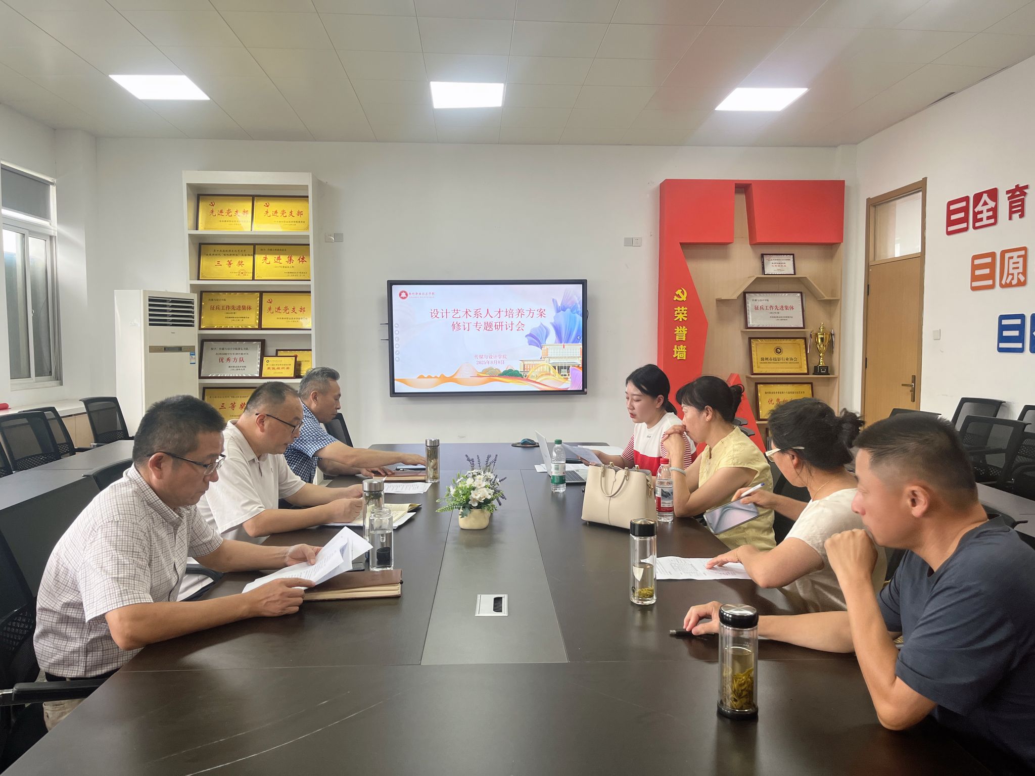 2025年8月8日下午,传媒与设计学院设计艺术系于德馨楼302会议室组织召开2025级专业人才培养方案修订专题研讨会。学院党总支书记王广保、院长闻建强、副院长杨之武,设计艺术系主任薛梦琪,以及室内艺术设计专业负责人黄瑞、艺术设计专业负责人王晓玮、工业设计专业负责人王起参加会议