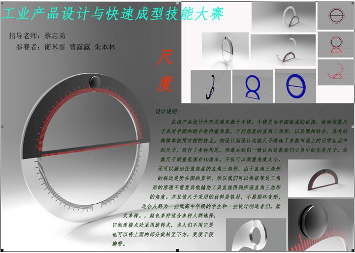 此次比赛主要面向传媒工程系工业设计专业同学,竞赛内容与往年安徽省及全国技能大赛——“工业产品造型设计与快速成型”竞赛项目接轨。经过精心组织和准备,比赛于12月9日在小家电工作室组织进行。比赛从上午8点到一直进行到下午4点。大赛环节包括创意形成、草图绘制、小组讨论、产品建模、作品排版等环节。经过近8个小时的比赛,最终决出一等奖1名,二等奖2名,三等奖3名。通过这次比赛,我们不仅检验了选手实践操作能力和临场应变、发挥能力,更检验了学生对所学知识的综合运用能力,同时也为今后本项目的省级技能大赛和国家级技能大赛打下基础。