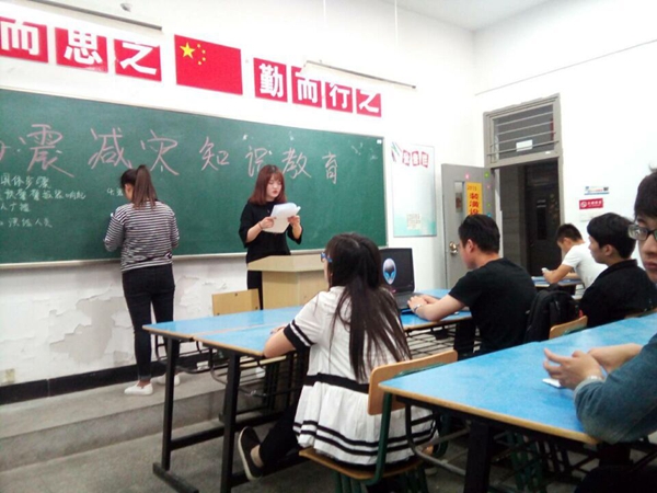 此次知识宣传活动由生活部张杰主持,重点阐述了震后避险、震后自护自救知识。并向同学提出三点要求:一是希望学生自觉学习地震科普知识,提高防震减灾意识;二是希望学生把地震科普知识传送到每个家庭,影响整个社会,确保一方平安;三是希望学生明天认真参加学校组织的安全演练,提高自己的防震逃生技能。最后由学生会主席程燕总结,并介绍明天学院防震应急疏散演练具体步骤。