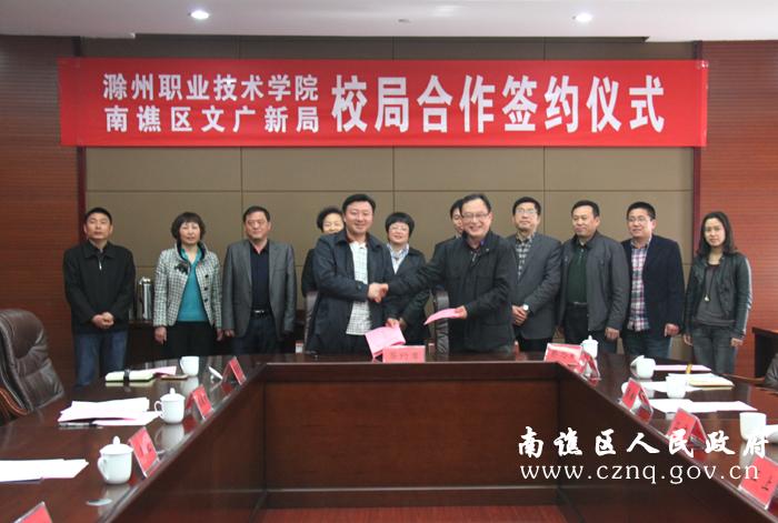 4月4日下午,传媒工程系与南谯区文广新局举办校局合作签约仪式。滁州市职业技术学院院党委委员、副院长江洁等领导,以及传媒工程系主要负责同志参加仪式。江院长一行受到区委常委、宣传部长尹虹,文广新局张成为局长的热情接待。