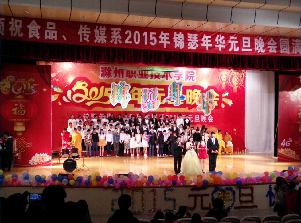 2014年12月30日晚,由传媒工程系和食品系共同举办的2015年锦瑟年华师生元旦联欢晚会在我院大礼堂隆重开幕。系领导莅临现场与我系学生共同欣赏晚会。 本次晚会以“锦瑟年华”为主题,节目精彩纷呈,一场独特的,欢乐的开场舞拉开了晚会的序幕,随后一场哑剧《较劲》,晚会成了欢乐的海洋,同学们脸上洋溢着青春的笑容。搞笑话剧、歌曲、舞蹈等将晚会气氛一次又一次的推向高潮。悦耳的歌声和曼妙的身姿演绎了这个炫舞飞扬的夜晚,激情的掌声和愉快的欢呼声点缀了这个流光溢彩的夜晚。