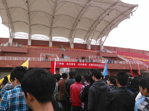 2014年3月31日中午,Beat365唯一官方网站在新操场举办 “走下网络,走出宿舍,走向操场”活动的开幕式。传媒工程系学生在团总支书记白琼的带领下参加活动开幕仪式。