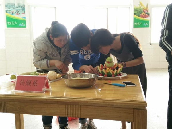 为体现当代大学生的青春活力和动手能力,2016年4月12日中午12:10分,院学生会在新食堂三楼举办了一次别有韵味的水果拼盘大赛。传媒工程系学生参加了本次比赛。