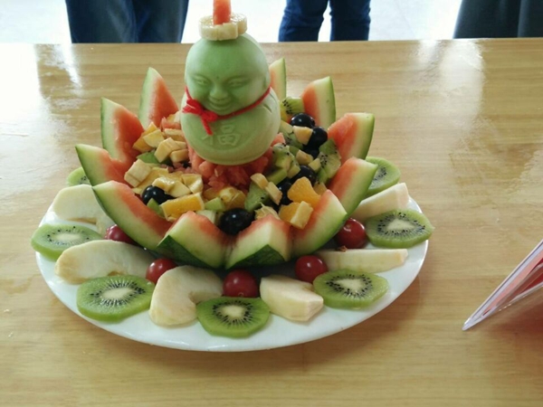 选手们对本次比赛充满期待,早早地准备好水果,构思好水果拼盘的设计。王云、杨继娟、尤淼三位选手同学互相商量、合作密切,经过一段时间的奋斗,大家的作品完美呈现在眼前,我系的果盘是以莲花为主题,莲花象牙塔由西瓜、苹果、猕猴桃、香蕉、人参果等组成的水果拼盘,五颜六色,人参果更是别具创意。希望同学们无论在校园还是踏入社会,都能像莲花一样纯洁。