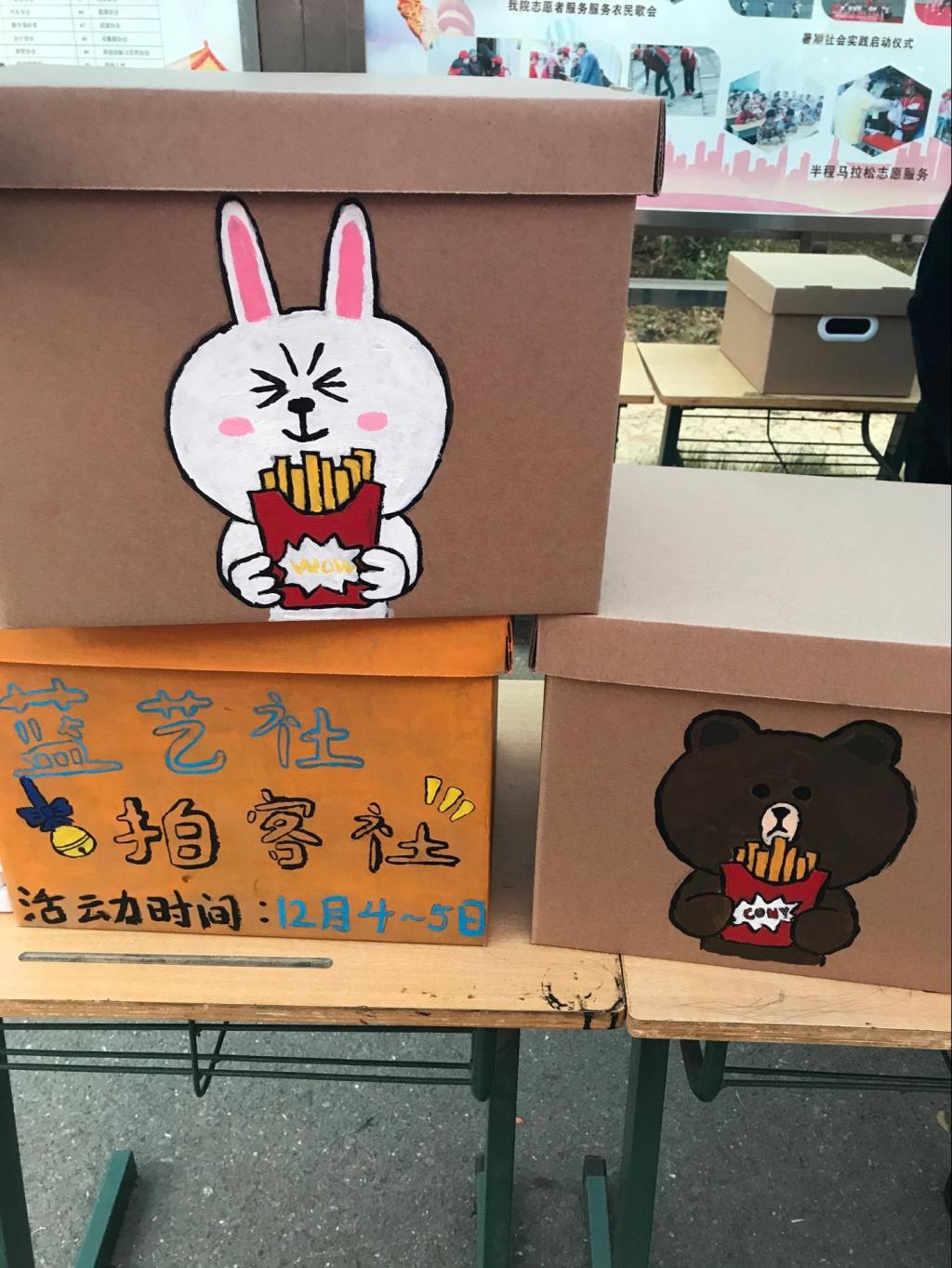 为了丰富校园文化生活,增强学生动手能力,传媒系拍客社、蓝艺社两个社团联合举办了一次手绘收纳盒活动。拍客社指导老师瞿康宁、王瑶参与此次活动。