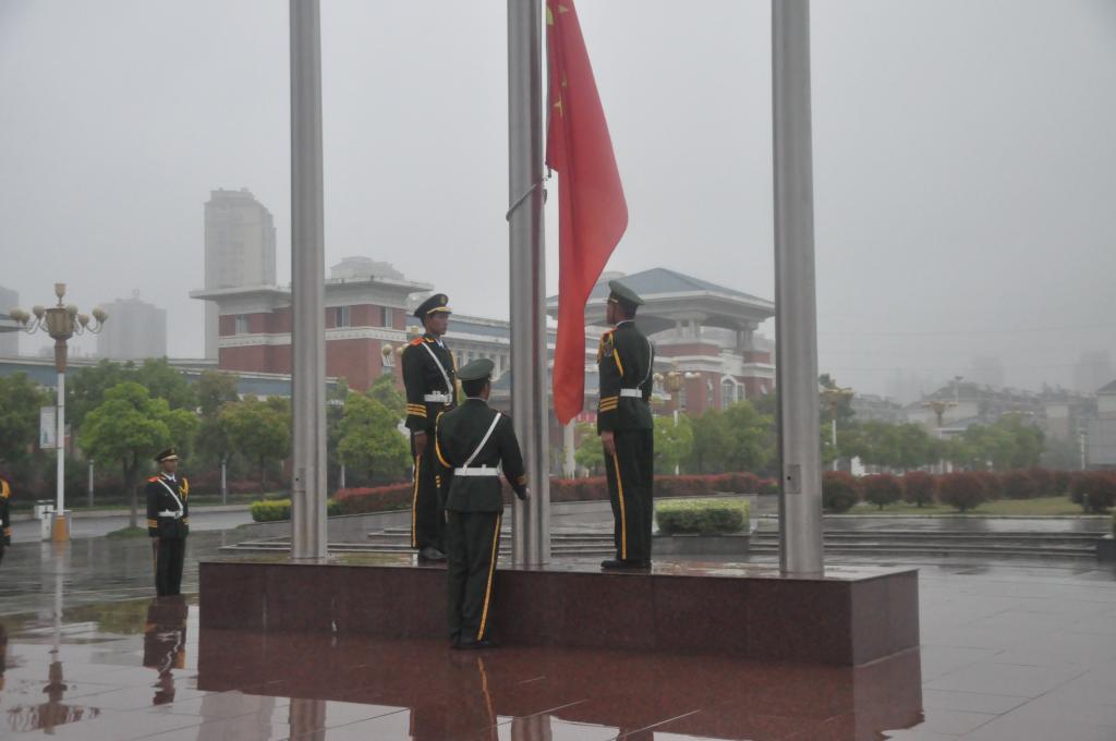 天刚微微亮,微风细雨中,传媒系学生会成员便已经在升旗台前列队等候。当国歌奏响,升旗仪式正式开始。随着旗手缓缓摇起摇杆,五星红旗冉冉升起,在场所有成员庄严肃立,目光都聚集在五星红旗之上。即使下着小雨刮着冷风,但同学们此刻的内心是热血沸腾的。