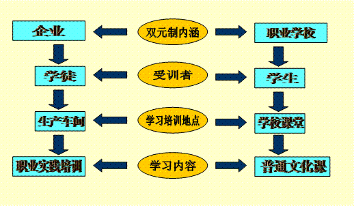 答:“双元制”教学模式德国先进的职业教育模式。实施“双元制”教学,理论教学时间与实践教学时间严格按照1:2的比例执行。理论课教学由学院承担,实训课教学由企业承担。教学计划由校企双方共同商定,理论课教材根据企业要求加以选择,考试由校企双方分别组织实施。学习地点是学校的课堂和企业的生产车间。受教育者既是学校的学生又是企业的学徒。