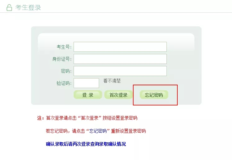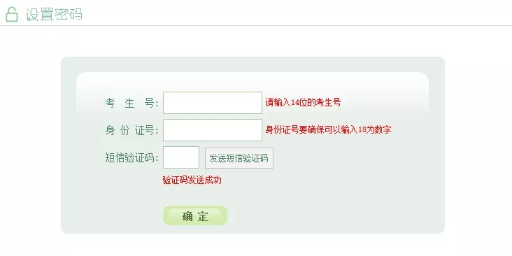 输入考生号,身份证号,点击“发送短信验证码”按钮后,系统会随机发送6位数字验证码至考生报名时所填的手机号上;填写完短信验证码,点击“确定”,跳转至考生修改密码页面,设置考生登录密码。短信验证码只能发送5次,请考生谨慎操作。