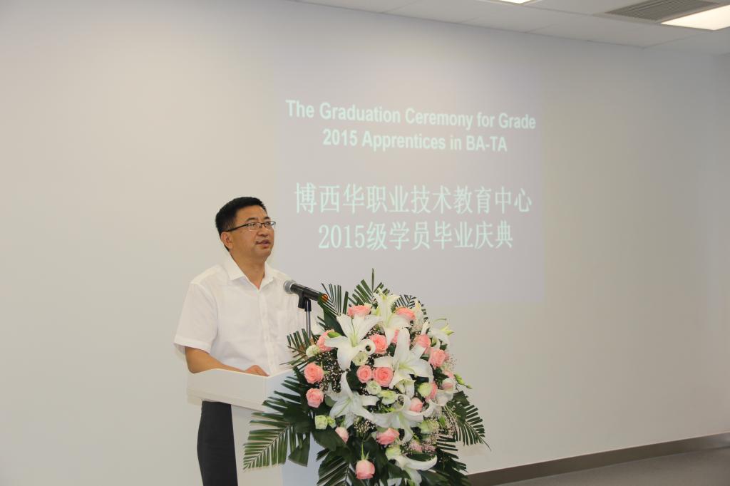 7月24日下午,学校2018届“博西华班”毕业典礼在博西华家用电器有限公司滁州家电园举行。博西华公司退返管理中心总监谢君,人力资源部经理付钢,洗碗机工程质量部经理盛志铭,学校党委委员、校长助理、招生就业处处长穆松出席了典礼。博西华职业教育中心的老师和“博西华班”30名毕业生参加了典礼。