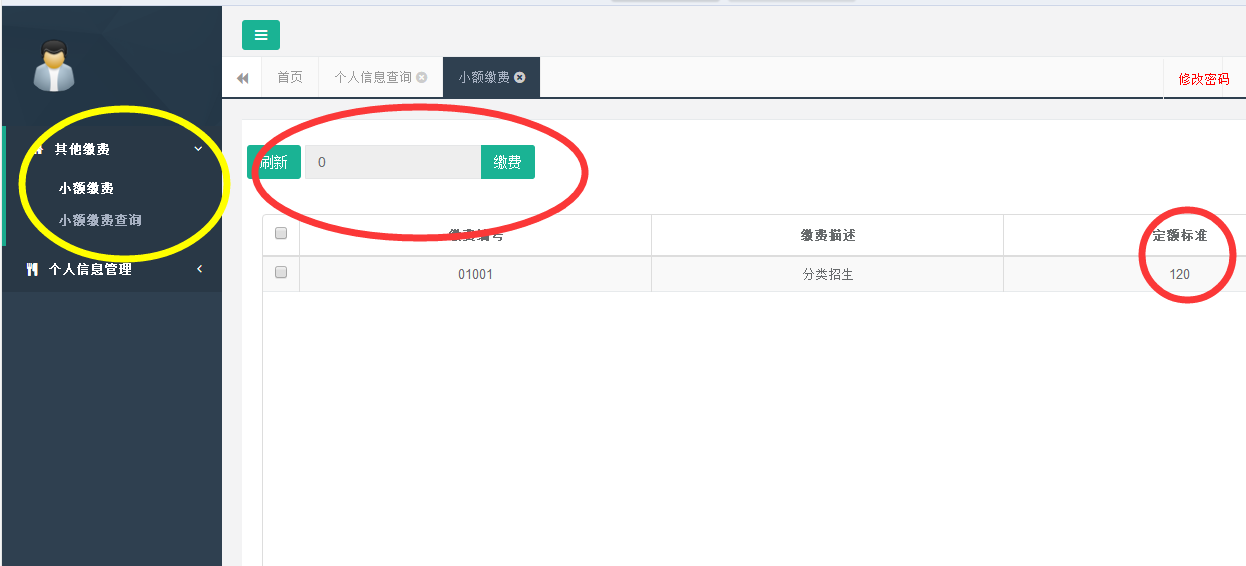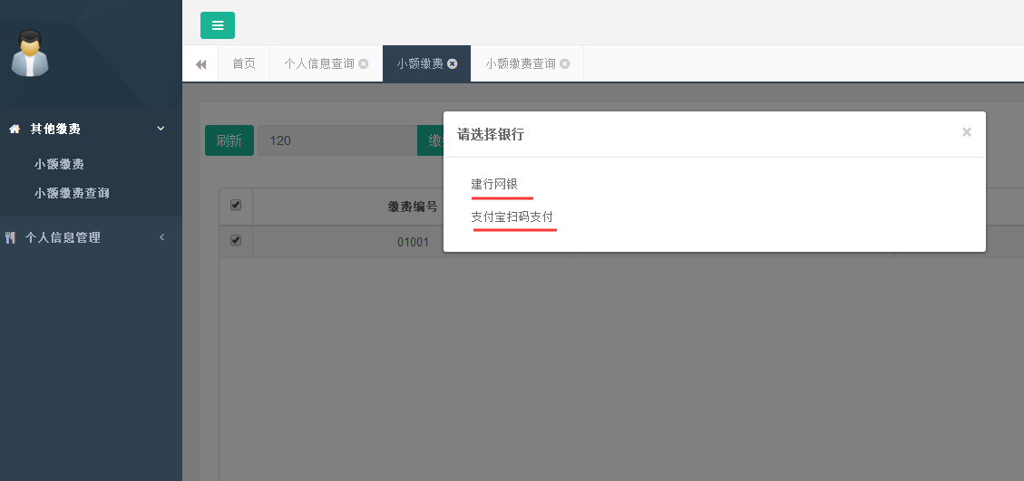 三、缴费(本系统支持建行网银、微信、支付宝扫码支付),进入系统后点击其他缴费菜单下小额缴费,如下图: