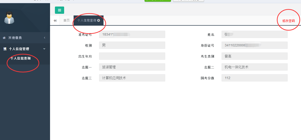二、个人信息查询:学生根据本的用户名及密码登录系统后,建议先修改个人登录密码,之后可以点击个人信息查询您的志愿情况,如下图