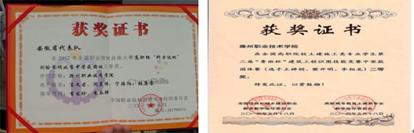 土木工程系学生参加省教育厅技能大赛“测量测绘”“工程造价”“建筑识图技能”项目等累计获得一等奖7项,二等奖15项。参加教育部土建施工类教指委“建筑识图技能大赛”获得一等奖1项,二等奖1项。获全国测绘大赛“三等奖”。