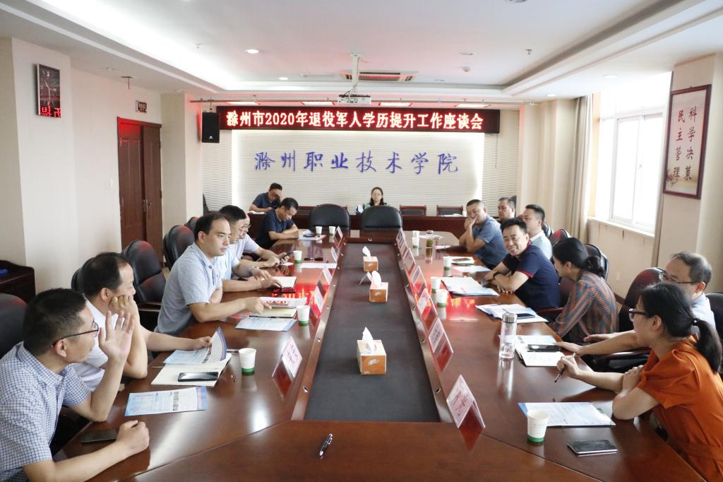 9月10日上午,Beat365在行政楼804会议室召开滁州市2020年退役军人学历提升工作座谈会。滁州市退役军人事务局及各县市区退役军人事务局负责人,校党委委员、校长助理、招生就业处处长穆松,继续教育学院院长李永泉等领导出席会议。会议由招生就业处副处长徐云龙主持。