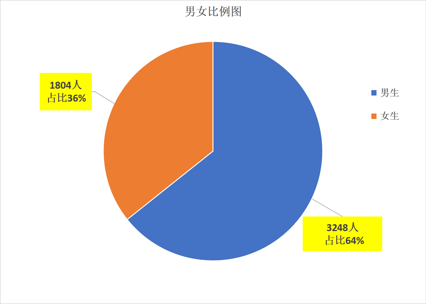 录取的5052名新生中男生有3248人,占64%,女生1804人,占36%。