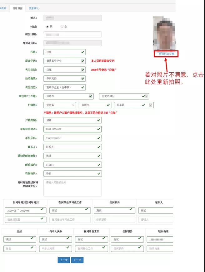 根据本人情况,依次选择或填写报名信息,填写完毕仔细检查,无误后点击“下一步”进入信息核对页面。