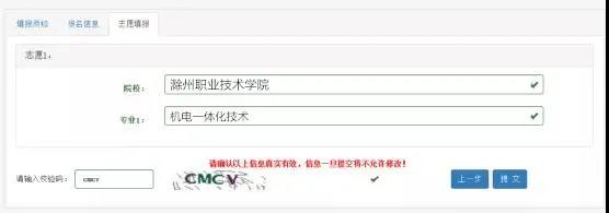 报名信息填报完成且提交后,将进入志愿填报页面。考生可选报三个院校,每个院校选择一个专业志愿。