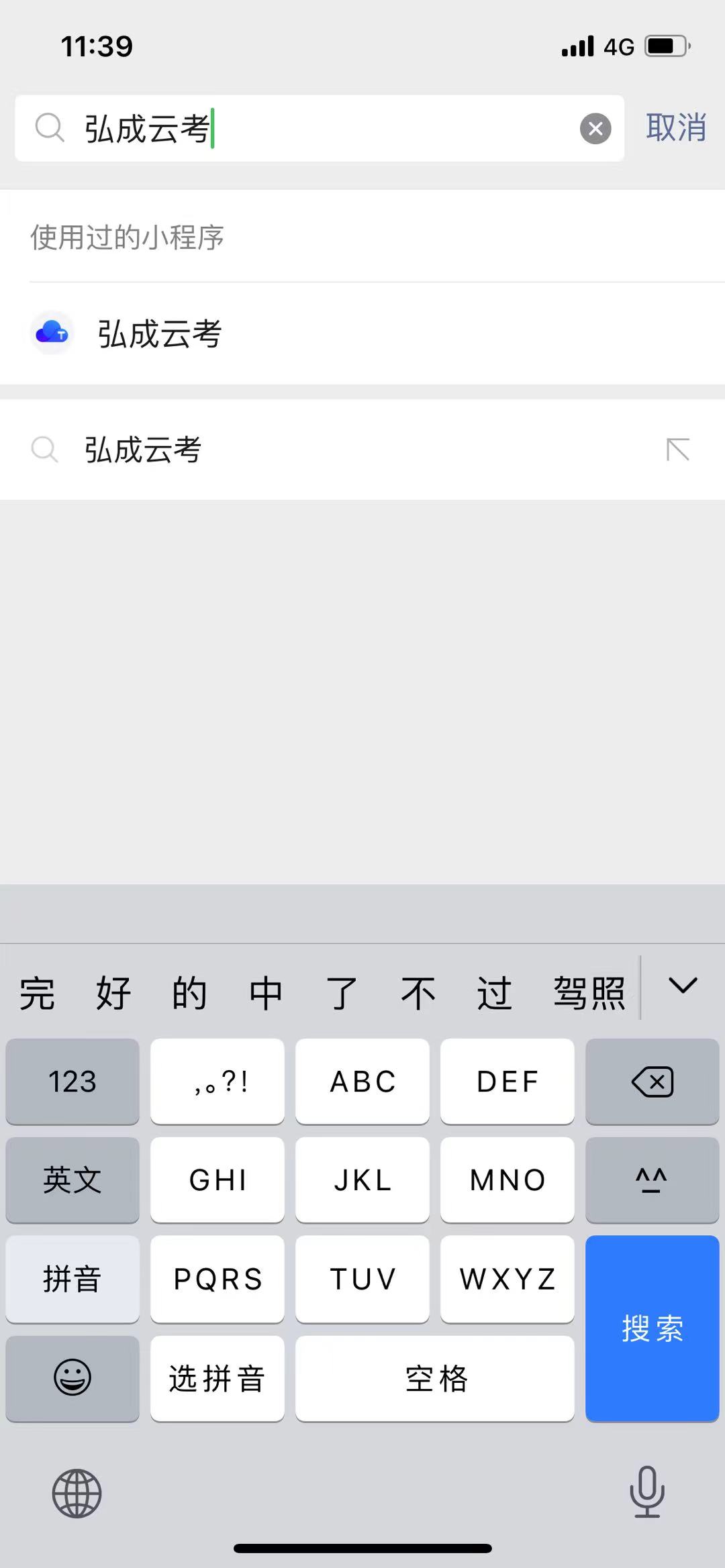 (1)注册并使用微信,搜索微信小程序“弘成云考”;