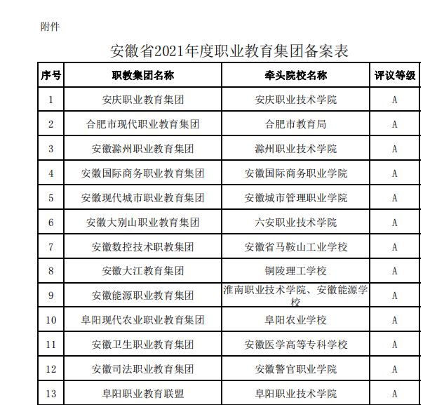 近日,省教育厅委托省职成教学会职教集团联盟对全省54家职教集团2021年度工作运行情况进行综合评议,滁州职教集团评议结果为“A等”,以第3名的成绩居全省前列,这是自省教育厅启动全省职教集团年度工作评议以来连续第四年获评A等。
