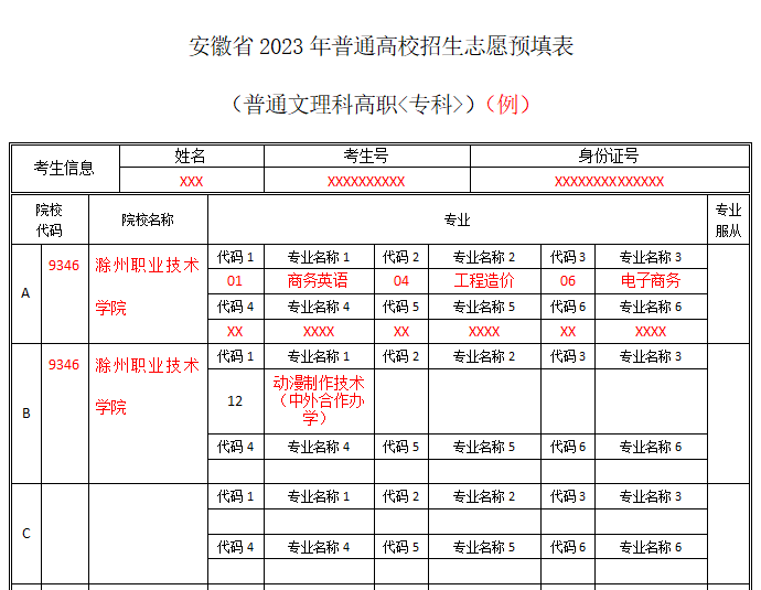 1.考生在上网录入志愿信息之前,应仔细了解我省志愿填报的有关政策及要求,并根据自身条件和意愿填写好《志愿预填表》(如图)。登录志愿填报系统后按照《志愿预填表》的内容在网上录入志愿信息。《志愿预填表》可在安徽省教育招生考试院网站“公告栏”中下载(https://www.ahzsks.cn/ptgxzs/6995.htm)。以下是志愿填报示例,仅供参考。
