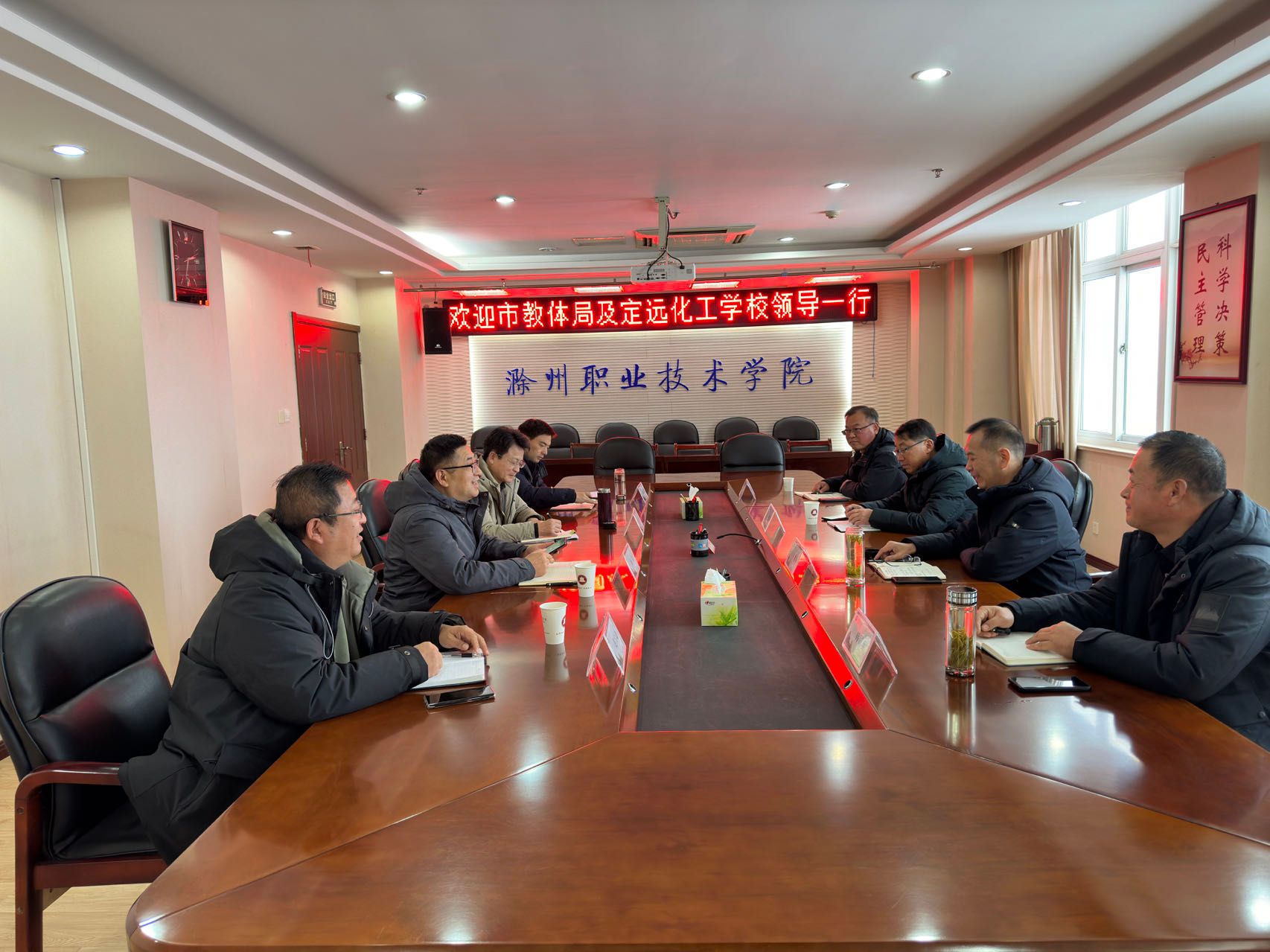 12月18日下午,滁州市教体局职成科科长蒋新华携定远化工学校党委书记许孝峰一行4人来校交流。校党委委员、副校长苏有良,校长助理、招就处处长、安徽滁州职业教育集团秘书长穆松在804会议室接待了来访嘉宾。