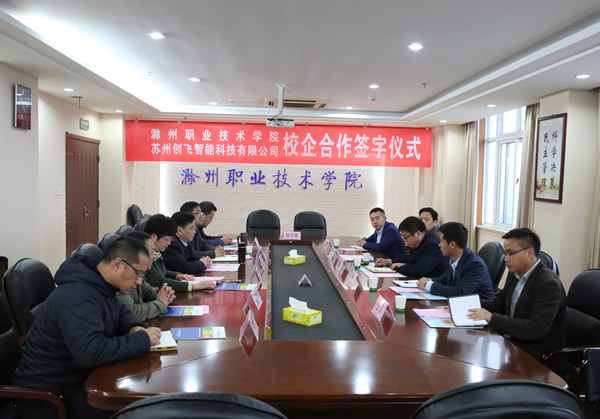 4月10日下午学院和苏州创飞智能科技有限公司签署了校企业合作协议。苏州创飞智能科技有限公司董事长官建军、公司运营总监鞠京梁、技术总工程师吴开吉,党委副书记、院长李柱梁,党委委员、副院长江洁,党委委员、院长助理、招生就业处处长穆松、信息工程系、教务处、招生就业处主要负责人参加了仪式。