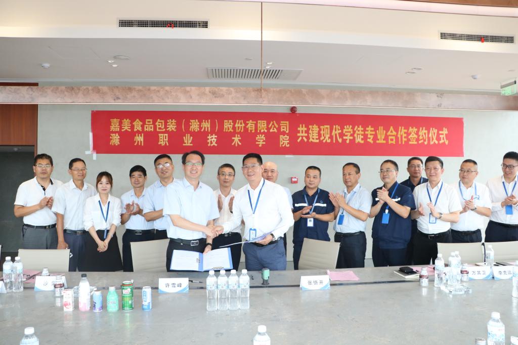 7月22日,Beat365与嘉美食品包装(滁州)股份有限公司共建现代学徒制专业合作签约仪式在嘉美集团总部举行。嘉美包装董事、运营副总裁张悟开、学校党委副书记、校长许雪峰,党委委员、校长助理、职教集团秘书长穆松等领导出席签约仪式。电气工程学院、食品与环境工程学院、招生就业处等部门负责人和多位嘉美集团中高层负责同志共同参加了签约仪式。仪式由嘉美包装监事、生产行政总监沙荣主持。