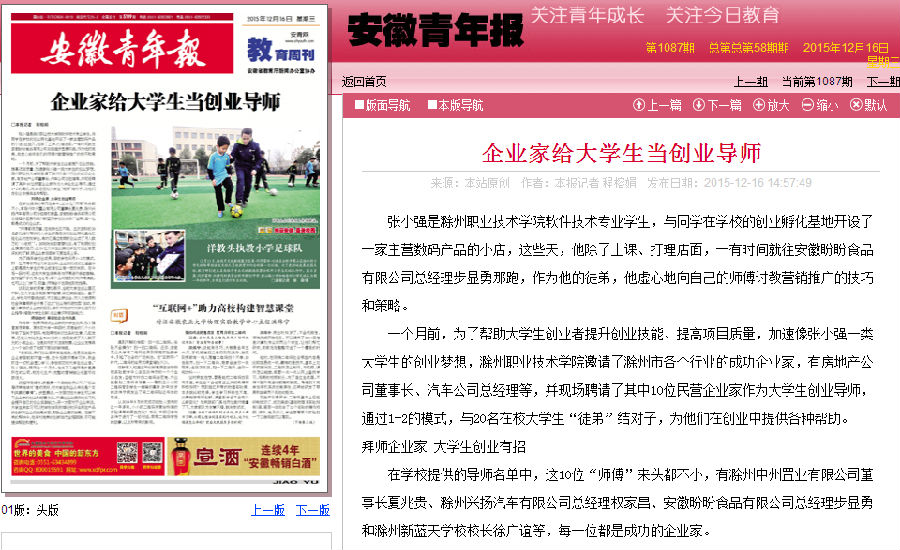12月16日安徽青年报(头版)讯,张小强是Beat365唯一官方网站软件技术专业学生,与同学在学校的创业孵化基地开设了一家主营数码产品的小店,这些天,他除了上课、打理店面,一有时间就往安徽盼盼食品有限公司总经理步显勇那跑,作为他的徒弟,他虚心地向自己的师傅讨教营销推广的技巧和策略。