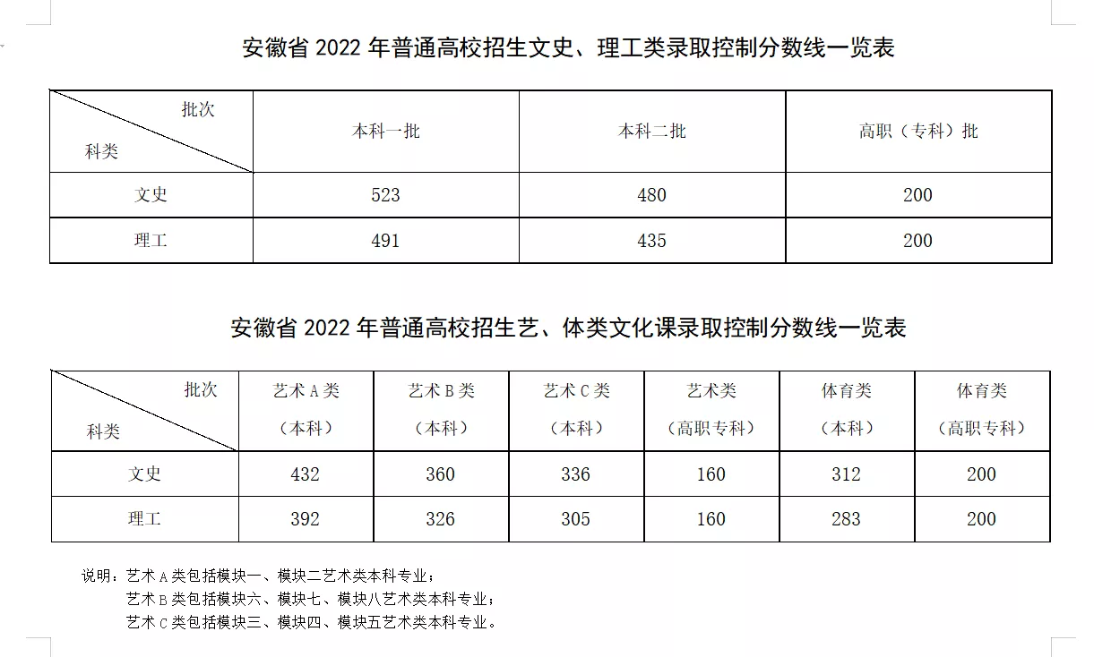 安徽省2022年普通高校招生文史、理工类和艺术类录取控制分数线一览表