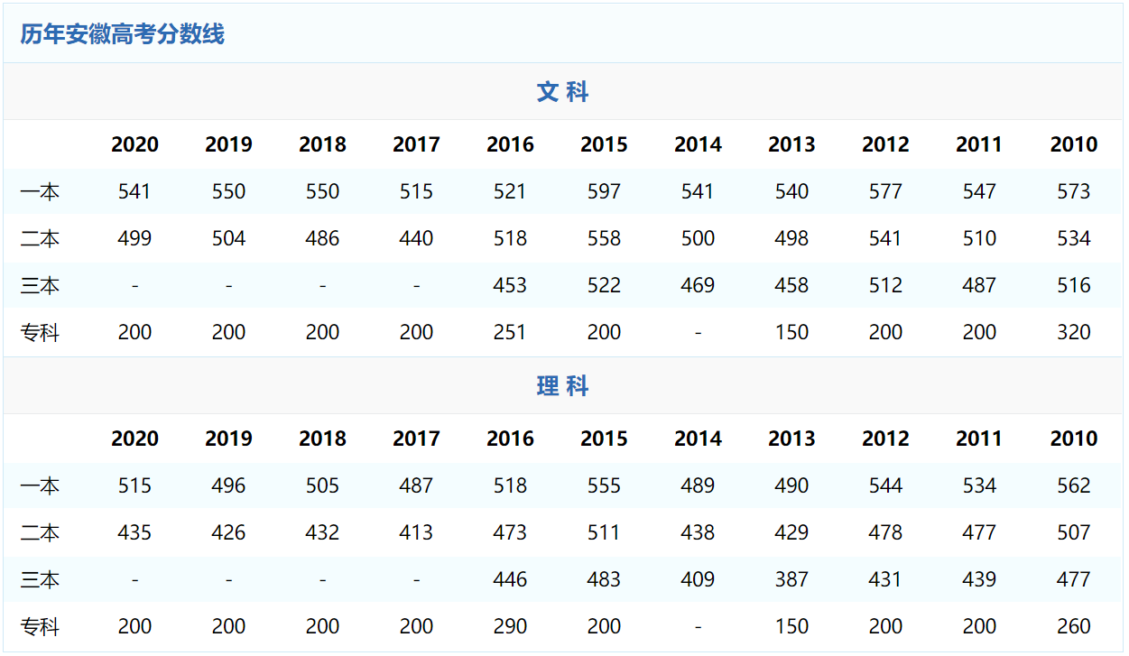 安徽省历年普通高校招生文史、理工类录取控制分数线一览表