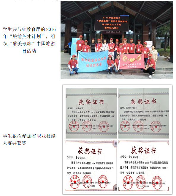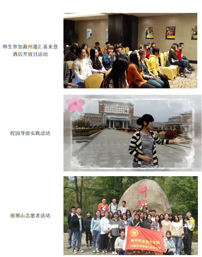 旅游管理专业目前为“省级特色专业”,并建有“省级示范实训中心”。目前校内有餐厅模拟实训室、客房模拟实训室、前厅模拟实训室、形体训练教室等实训场所,为学生的校内教学提供仿真实践教学环境;同时与滁州及上海、南京等地的多家星级酒店、餐厅、旅行社、旅游景区等企事业单位密切合作,建立校外实训基地,为学生就业提供坚实的培训条件和保障。