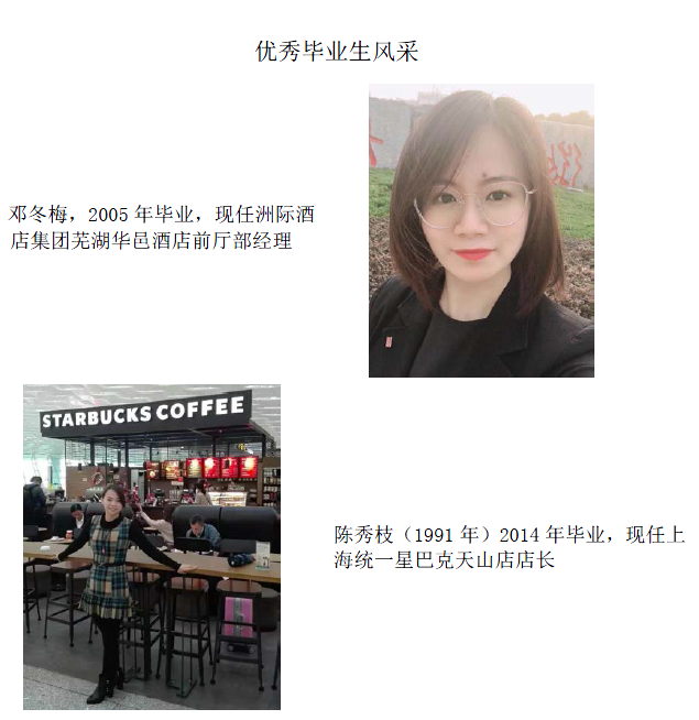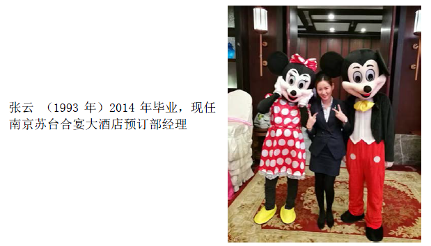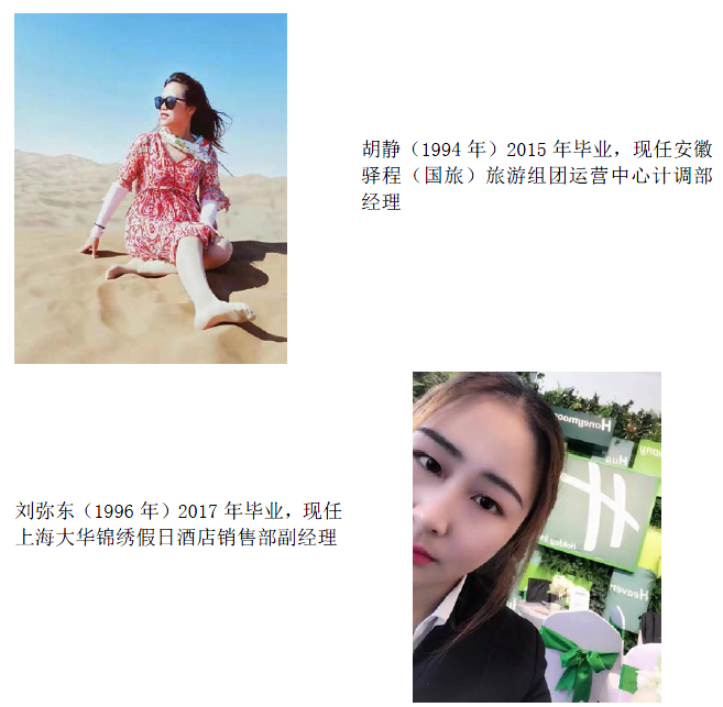 旅游管理专业学生自2003年设立以来,至今已有十二届毕业生,平均就业率均在97%以上。部分学生在长三角地区的高星级酒店、品牌餐饮企业、旅行社、旅游景区及相关企事业单位担任服务及管理人员,备受社会好评。