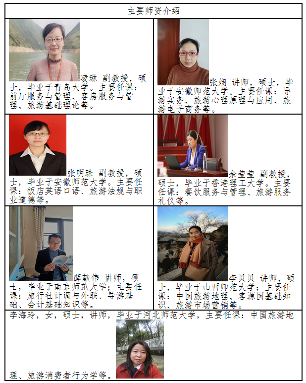 本专业师资队伍皆有旅游管理专业教育背景,副高级及以上职称占50%;中级以上职称占专职教师比例达100%。专业课教师研究生学历或硕士学位比例为100%,双师素质教师占专任教师比例的75%,其中四名教师拥有导游资格证书,且具备旅行社企业实践经验,三名教师具备饭店服务技能鉴定考评员资质,能够满足专业实践教学的需要。
