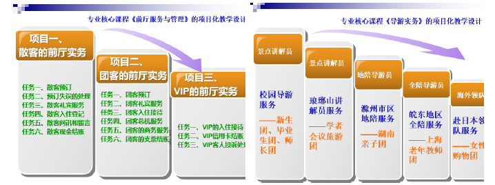 本专业以几种典型的旅游企业岗位为主导进行课程设置,并在教学安排上采取“先学后工”——即先岗位能力集中训练、后顶岗工作锻炼的递进培养的方式。具体开课形式为“2+0.5+0.5”,即在前四个学期进行校内学习,围绕酒店、旅行社及旅游景区等旅游企业的典型岗位开设能力培养所需的专业课程;在第五学期,进行一个学期的以培养适应性为目标的跟岗实习,最后在第六学期进行毕业顶岗实习(企业综合实习)。