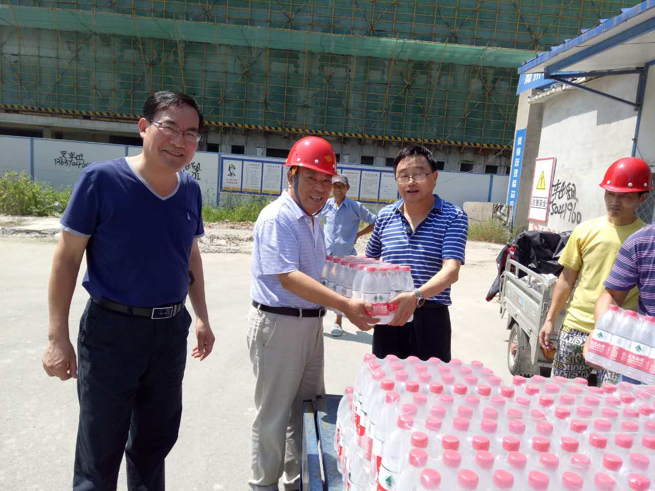 2016年7月26日上午,学院副院长程一斌携总务处李有志、朱国新、王磊一行赴学院11#-12#学生公寓施工现场,向高温酷暑下工作的施工人员表示慰问,特意送去40箱矿泉水,并安排学院食堂定期供应绿豆汤。同时召开了工程协调会,程院长指出,学生公寓开学必须能保证投入使用,时间紧,任务重,希望加强管理,遇到问题及时协调沟通,确保按期完工,但暑期高温,要注意防暑降温,确保安全。