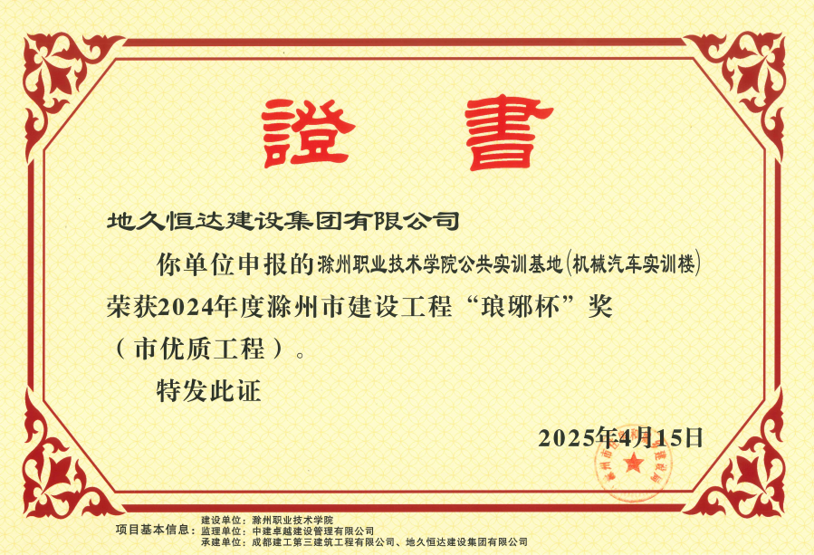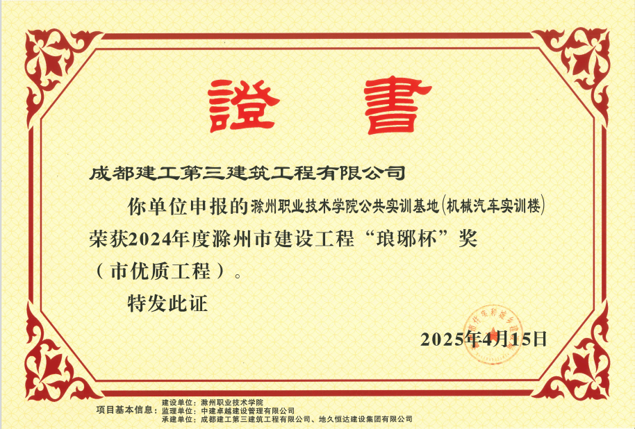 4月15日,滁州市住房和城乡建设局对2024年度“琅琊杯”奖项目名单进行公示,Beat365公共实训基地(机械汽车实训楼)建设项目顺利获评位列其中。