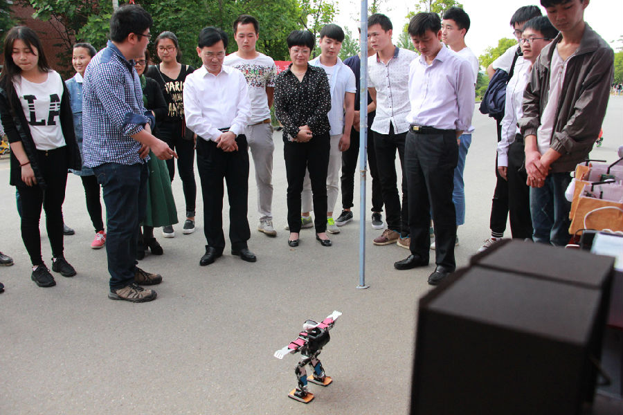 科普进校园主要有科普知识展和学院师生科技成果展两个方面。科普知识展内容丰富,有专利法知识简介、有食品安全、有公民健康常识、有生产安全常识和“化学与生活”主题等等专题。4月18日的科技成果展,展示了我院师生共同研发的科技作品,有信息系刘青老师带队研发的“舞蹈机器人”、“智能家居”、“智能小车”,有汽车系廖玉松老师带队研发的“一种机械传动演示台”发明专利产品。学院李柱梁院长、江洁副院长和汪上副院长也来到了展示现场。院领导们在观看了舞蹈机器人的表演后,对于产品的研发过程与留情老师做了交流,并对“机器人”“智能家居”等作品的改进做了建议,在肯定刘老师的成绩之后,鼓励刘老师敢于在国家级技能竞赛平台上一展技艺。