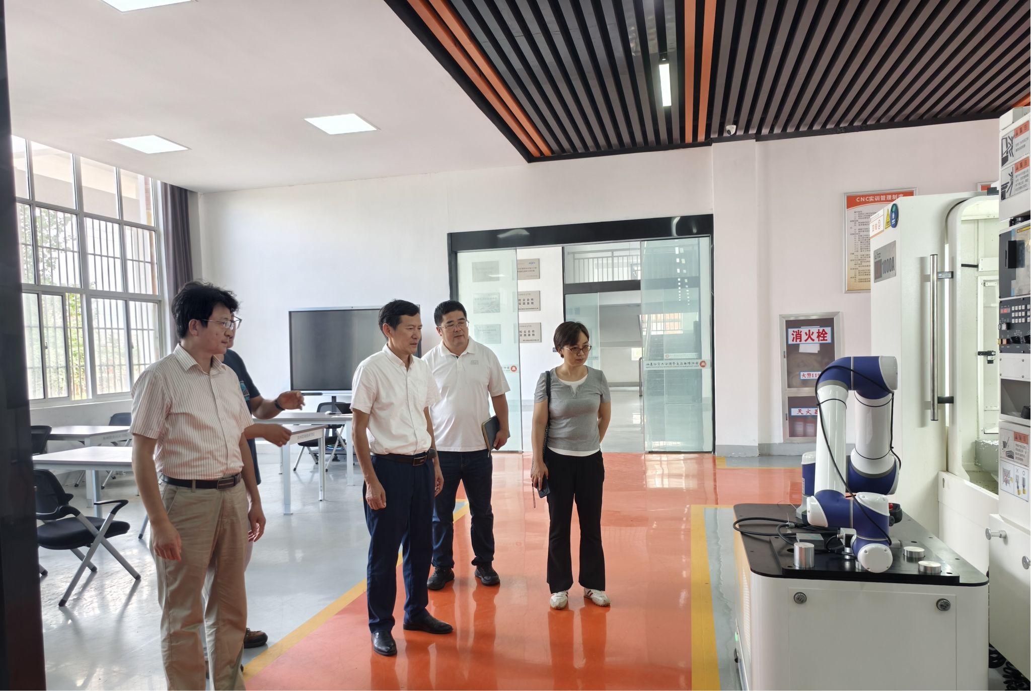 淦爱品一行在苏有良等陪同下,实地考察了学校智能制造实训基地、建筑工程实验实训中心。